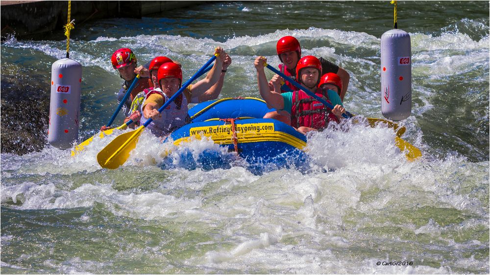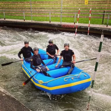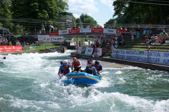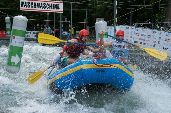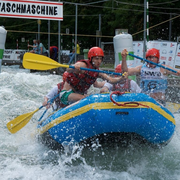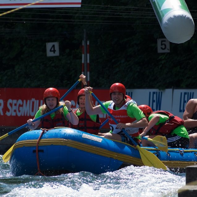 Rafting an der Olympischen Wildwasserstrecke fördert Teamgeist und Zusammenarbeit. Gemeinsam Herausforderungen meistern und die Natur erleben stärkt den Zusammenhalt im Outdoor-Teambuilding.